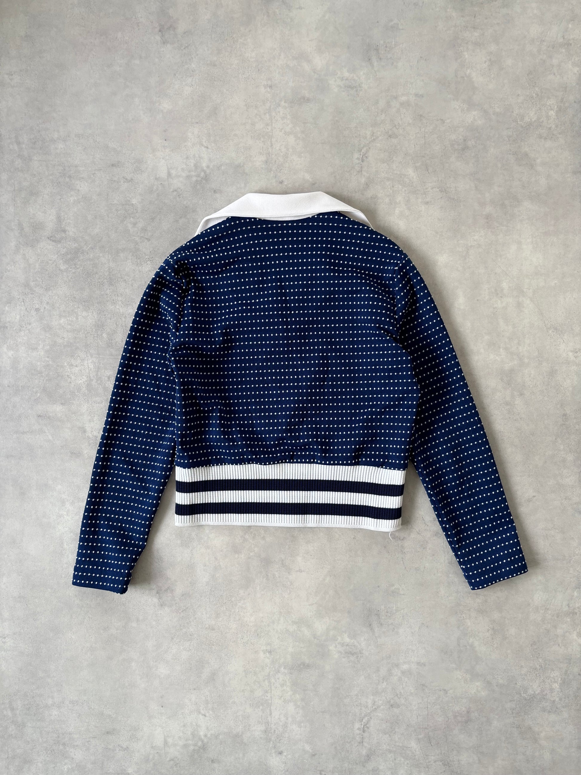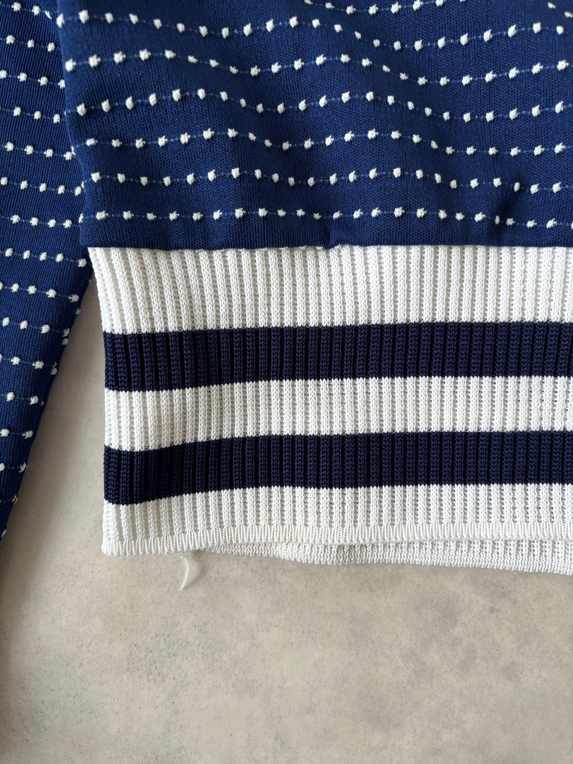 ネイビー地にホワイトのドット柄が可愛らしく映え、裾にはネイビーとホワイトのボーダーニットがあしらわれた秀逸なデザインです。